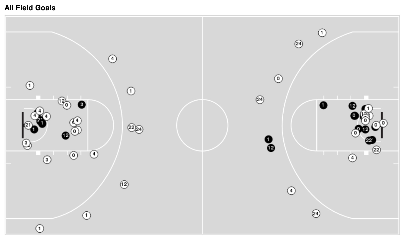 So, like with the offensive breakdown, we’ll start with the official shot chart. In the inverse of what you want to see from your team, more mid-range jumpers is good here. And we get a bit of a tale of two halves. Left is first half, right is second: