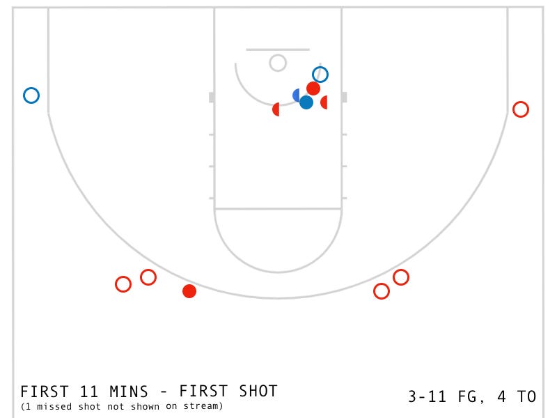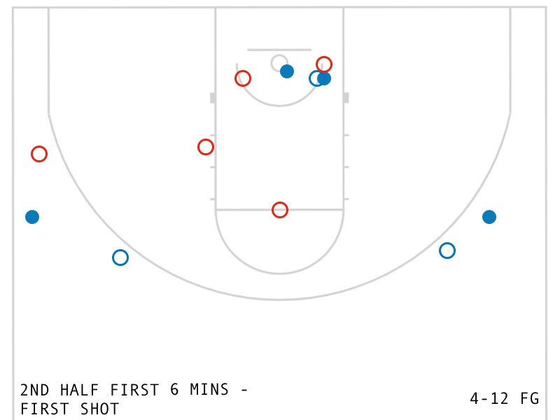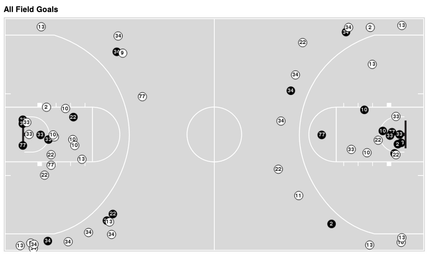 First, let’s just look the overall shot chart for the Racers. This is the official shot chart which shows makes and misses — the right side of the chart is the first half, the left side the second. (It’s the opposite of the directions Murray went on stream because the scorers table is on the other side from the camera) Black dots are makes, white dots are misses, and the number is the jersey number of the shooter.