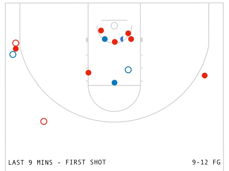 Blue Circles: Shots off misses or makes — without a stoppage — with the shot clock >18. (We’re calling these transition shots. Some aren’t directly in transition, they’re the result of transition movement, coming without a ‘reset’)